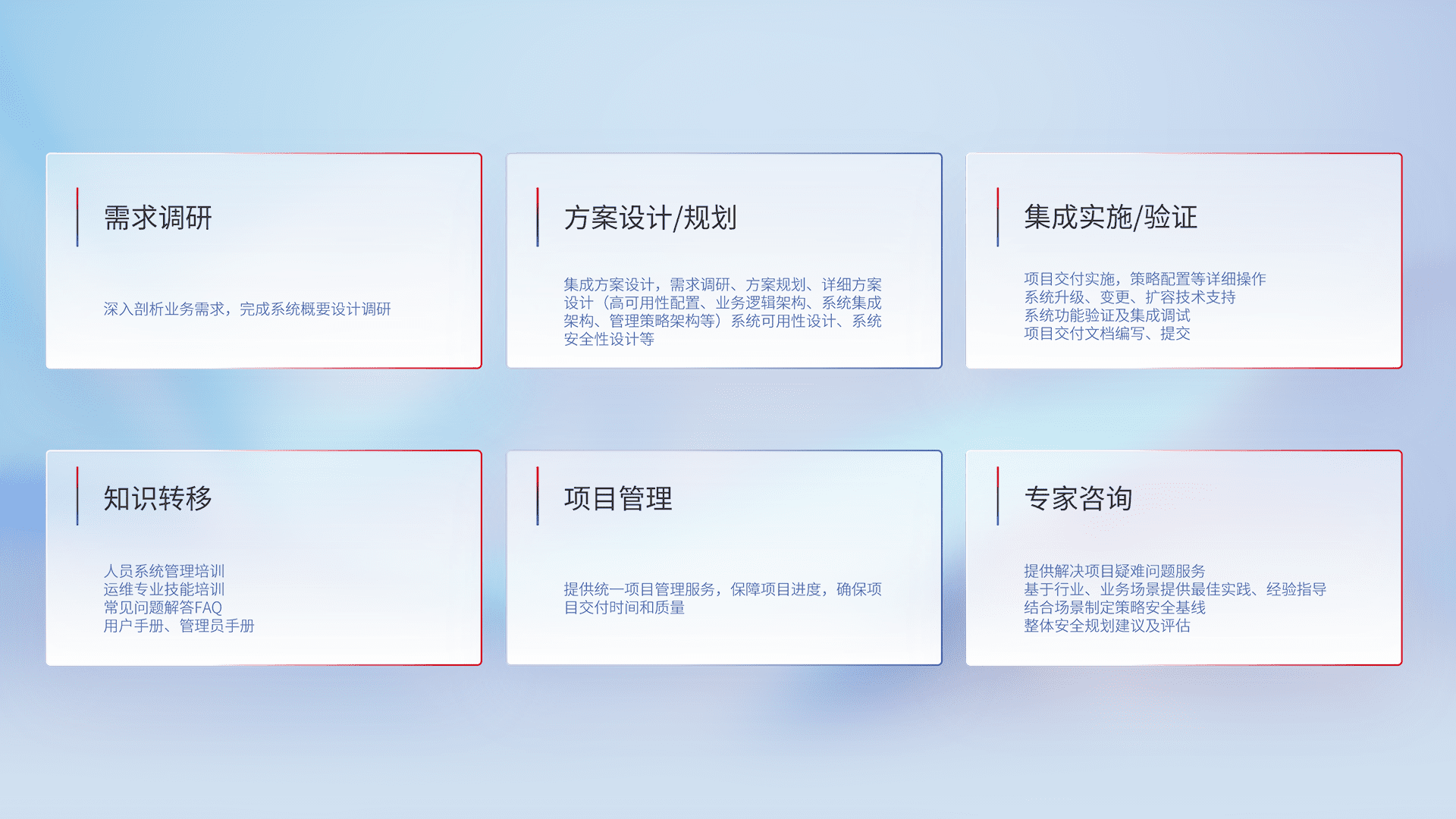 针对客户行业特性,,,将宏观的安全战略和需求,,,通过专业的交付服务,,实现项目落地,,,为客户提供标准规范的集成交付服务。。