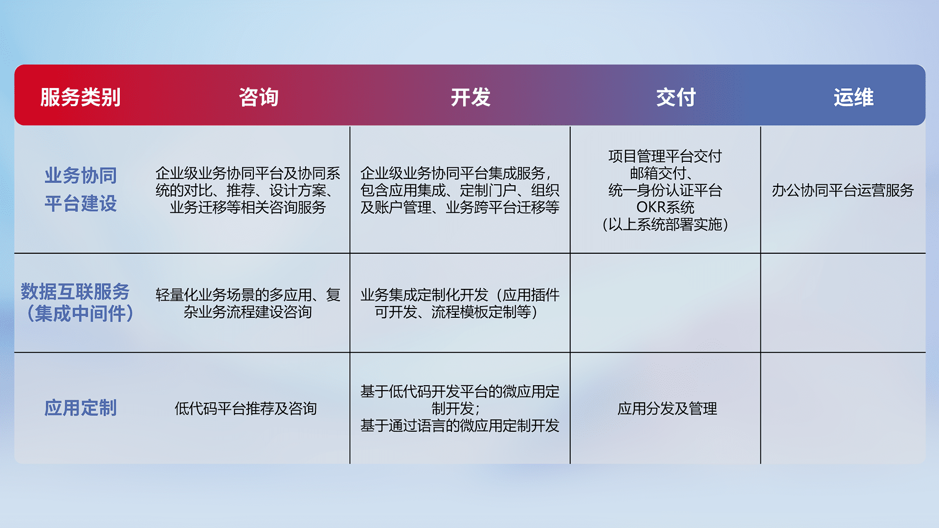 针对钉钉、、企微、、、、IDaas等平台级产品提供产品的规划、、方案、、交付、、定制化开发等服务,,,,实现如统一协同办公、、智能客户服务、、、、混合会议管理、、、、智能数据查询、、、等业务场景,,,,实现数字化转型。。。